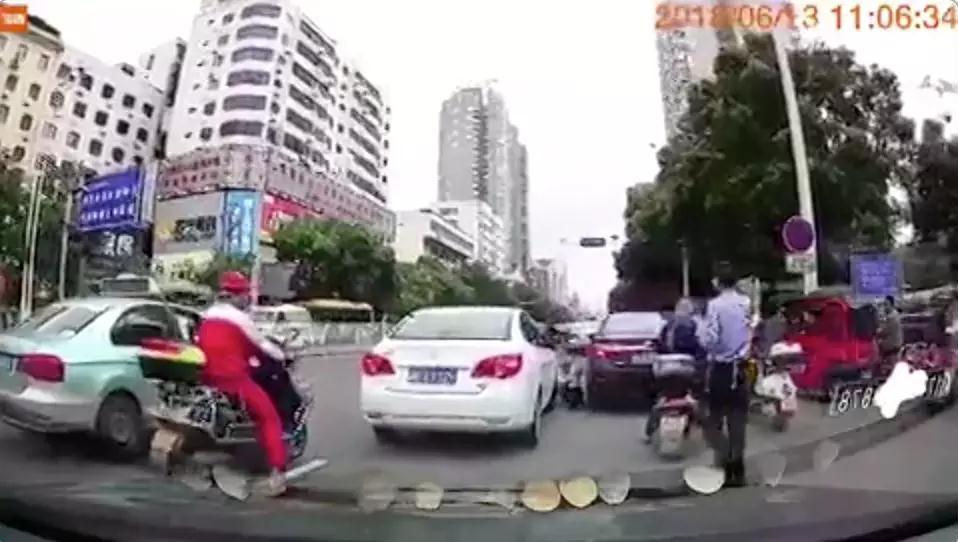 在另外一段視頻中,當(dāng)事交警坐在地上,一名穿著白色衣服的男子試圖攙扶起該交警,但被該交警拒絕。