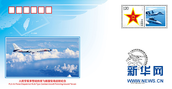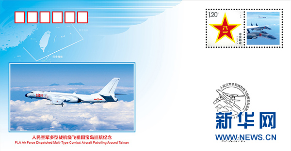這次發(fā)行的一套兩枚中英文版紀念封,是中國集郵總公司根據(jù)新華社公開播發(fā)的有關報道和新聞照片設計制作,記錄了空軍轟-6K等多型戰(zhàn)機多次繞飛祖國寶島巡航的航跡。
