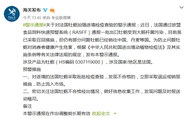 海關(guān)總署警示通報稱,近日,法國通過歐盟食品飼料快速預(yù)警系統(tǒng)(RASFF)通報一批出口牡蠣受到大腸桿菌污染,目前雖已采取召回措施,但仍有部分問題牡蠣已經(jīng)銷往中國、丹麥等國。
