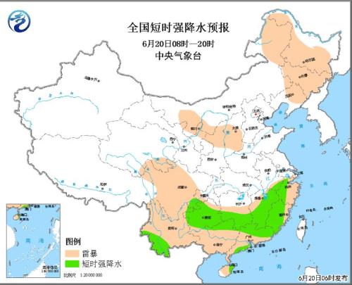 預(yù)計(jì)6月20日08時(shí)到21日08時(shí),貴州、湖南中南部、江西、浙江、福建、廣東中北部、海南東北部、云南西南部等地的部分地區(qū)將有短時(shí)強(qiáng)降水天氣,小時(shí)雨強(qiáng)20-50毫米,局地可達(dá)60毫米以上;另外,內(nèi)蒙古中部和東部、吉林南部、遼寧東北部、浙江南部、福建北部和南部、廣東北部等地局地將有雷暴大風(fēng)或冰雹天氣。
