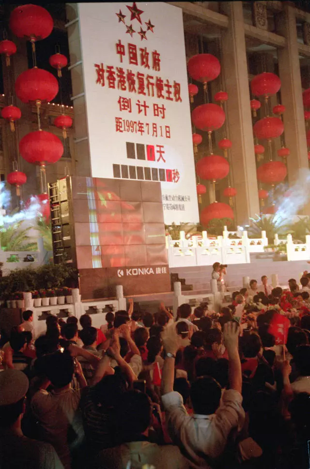 1997年7月1日零點(diǎn),在天安門(mén)廣場(chǎng)參加北京市人民迎接香港回歸祖國(guó)聯(lián)歡會(huì)的人們觀(guān)看香港政權(quán)交接儀式的電視直播。中國(guó)政府對(duì)香港恢復(fù)行使主權(quán)倒計(jì)時(shí)牌標(biāo)出:距1997年7月1日還有零天,零秒。新華社發(fā)