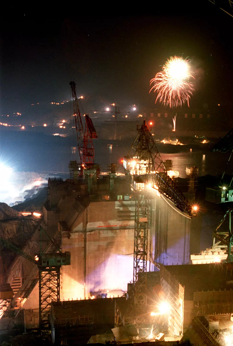 1997年6月30日晚,正在承建三峽工程導(dǎo)流明渠、臨時(shí)船閘、大江截流等施工項(xiàng)目的葛洲壩集團(tuán)公司職工在工地上燃放焰火,慶祝香港回歸。新華社記者 杜華舉 攝