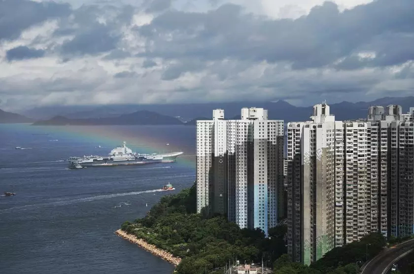 2017年7月7日,海軍遼寧艦在香港南丫島附近航行。當(dāng)日,正在執(zhí)行跨區(qū)機(jī)動(dòng)訓(xùn)練任務(wù)的中國(guó)人民解放軍海軍航母編隊(duì)抵達(dá)香港,參加香港回歸祖國(guó)暨中國(guó)人民解放軍進(jìn)駐香港20周年慶?;顒?dòng),受到香港特區(qū)政府和民眾熱烈歡迎。 新華社發(fā)(王申攝)
