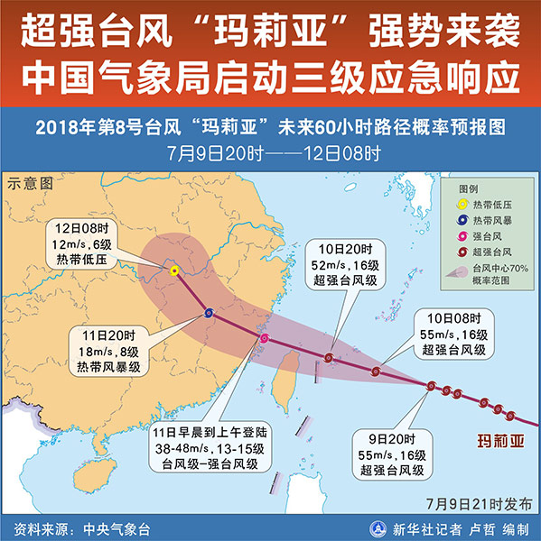 中央氣象臺(tái)預(yù)報(bào),今年第8號(hào)超強(qiáng)臺(tái)風(fēng)“瑪莉亞”中心9日8時(shí)位于臺(tái)灣省宜蘭縣東偏南方約1260公里的西北太平洋洋面上。預(yù)計(jì)將以每小時(shí)30公里左右的速度向西偏北方向移動(dòng),逐漸向臺(tái)灣以東洋面靠近,將于10日夜間登陸或擦過臺(tái)灣東北部,并于11日早晨到上午在福建晉江到浙江溫州之間沿海再次登陸。登陸后繼續(xù)向西北方向移動(dòng),強(qiáng)度逐漸減弱。