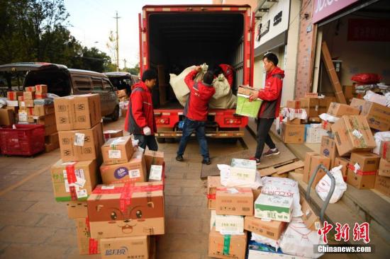 工作人員將分揀后的商品裝車。中新社記者 劉冉陽 攝