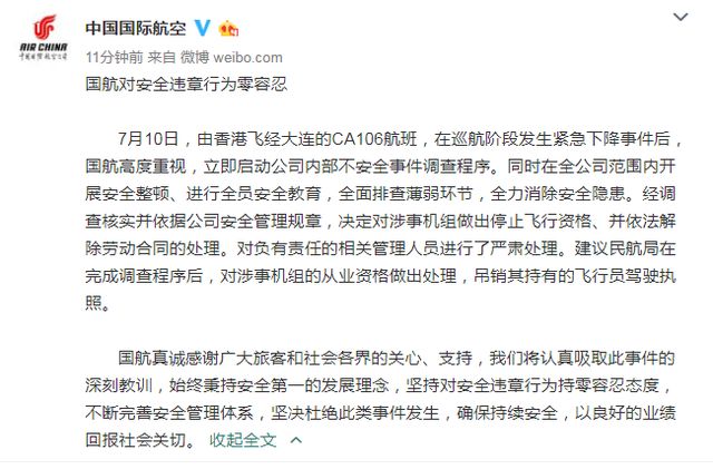 國航方面11日通過其官方微博回應(yīng)稱,目前機組正在接受中國民用航空局相關(guān)部門的調(diào)查,如果調(diào)查發(fā)現(xiàn)機組存在違章違規(guī)行為,公司將以零容忍的態(tài)度對責(zé)任人嚴肅處理。2018-07-11 22:19:03