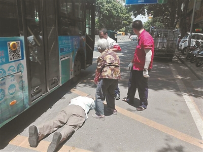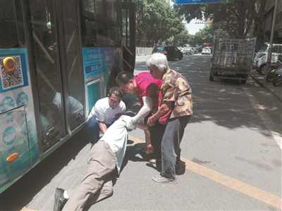 阿伯在公交站旁摔倒。