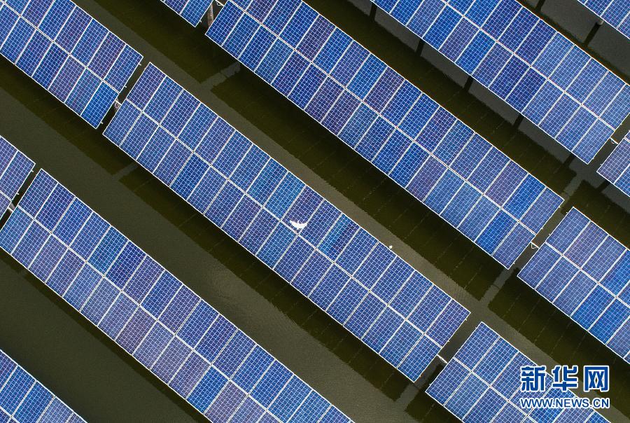 一只白鷺從光伏板上飛過(6月21日攝)。浙江省湖州市和孚鎮(zhèn)的“漁光互補”光伏發(fā)電項目建設在4200多畝魚塘上,40多萬塊太陽能光伏板下養(yǎng)殖小龍蝦和青蝦等水產(chǎn),千畝魚塘與綠色光伏電站構成一幅和諧的生態(tài)美景圖。 新華社記者 徐昱 攝