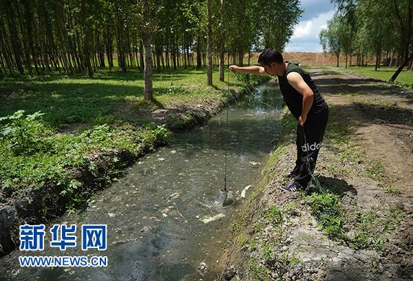 在吉林省長(zhǎng)春市,黑臭水體專(zhuān)項(xiàng)督查組工作人員在一處向新凱河排水的水溝采樣(6月28日攝)。 新華社記者 才揚(yáng) 攝