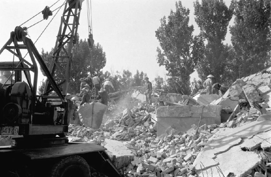 1976年7月28日,強烈地震中,唐山礦業(yè)學院宿舍樓被震毀。新華社記者 官天一 攝