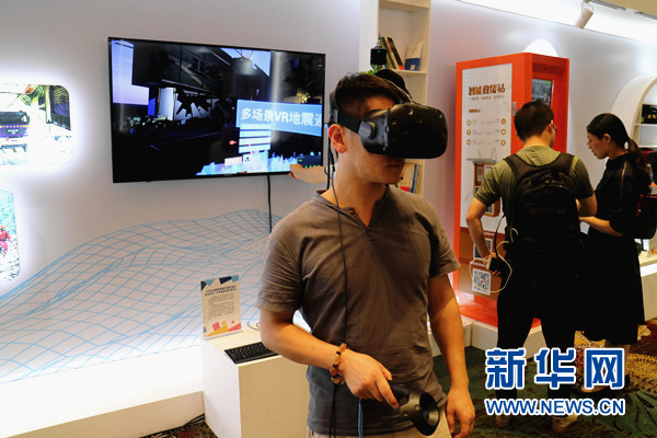 圖為參展人員體驗(yàn)VR地震模擬器。新華網(wǎng)汪亞/攝