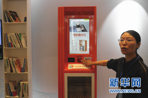 圖為工作人員在講解智能救援站的使用方法。新華網(wǎng)汪亞/攝