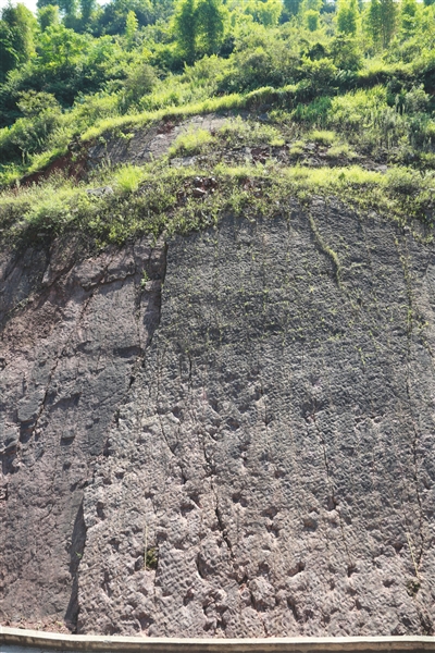 2013年夏,茅臺鎮(zhèn)赤水河畔的釣魚臺酒業(yè)公司在建設制酒車間時,考慮到后側邊坡地帶巖層不夠牢固,便對邊坡進行清理。清理至下部半米時發(fā)現(xiàn)一個完整的巖石平面,質地堅硬,有許多凹凸和深淺不一的印痕。2017年夏,該公司員工看到貴州習水恐龍足跡的報道后,認為后山的凹坑可能是某種足跡,于是多方聯(lián)系專家,對比相關信息。
