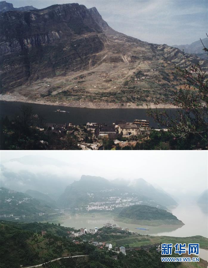 中游秭歸縣長江村。拼版照片:上圖為滑坡后的秭歸縣新灘古鎮(zhèn)(新華社發(fā),資料照片);下圖為7月6日拍攝的湖北省秭歸縣屈原鎮(zhèn)長江村(新華社記者王斯班攝)。新華社發(fā)