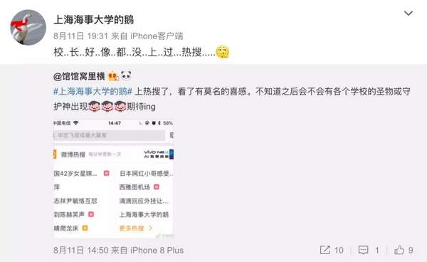 11日,“上海海事大學(xué)的鵝”還在微博上驕傲地說,校長(zhǎng)好像都沒有上過熱搜,我們已經(jīng)上了,還配了一張“上海海事大學(xué)的鵝”登熱搜的截圖。