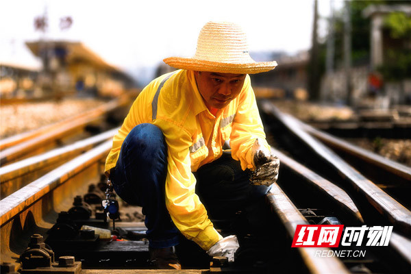近日,記者跟隨長沙電務(wù)段工作人員一同進入長沙火車站站場,看到該段長沙信號車間的10余名信號工,頭戴草帽、手拿工具正在進行檢修作業(yè)。“我們工區(qū)主要是負責道岔‘病害’整治,工作強度大,上線作業(yè)5分鐘,工作服幾乎汗透?!?1歲的長沙東信號檢修工區(qū)工長董文海說道。