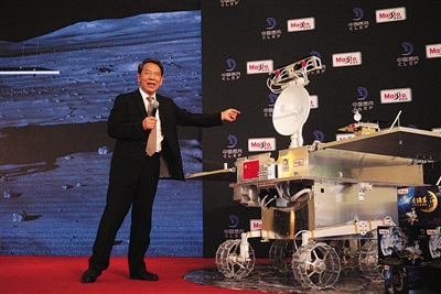 昨日,中國工程院院士、中國探月工程總設(shè)計師吳偉仁介紹嫦娥四號月球車外觀和設(shè)計。記者 倪偉 攝