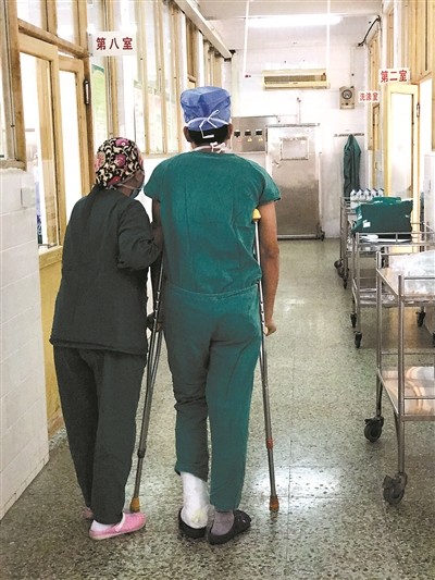 泗陽縣中醫(yī)院泌尿外科醫(yī)生劉玉忠為擇期手術(shù)病人拄拐上陣,堅(jiān)持手術(shù)。