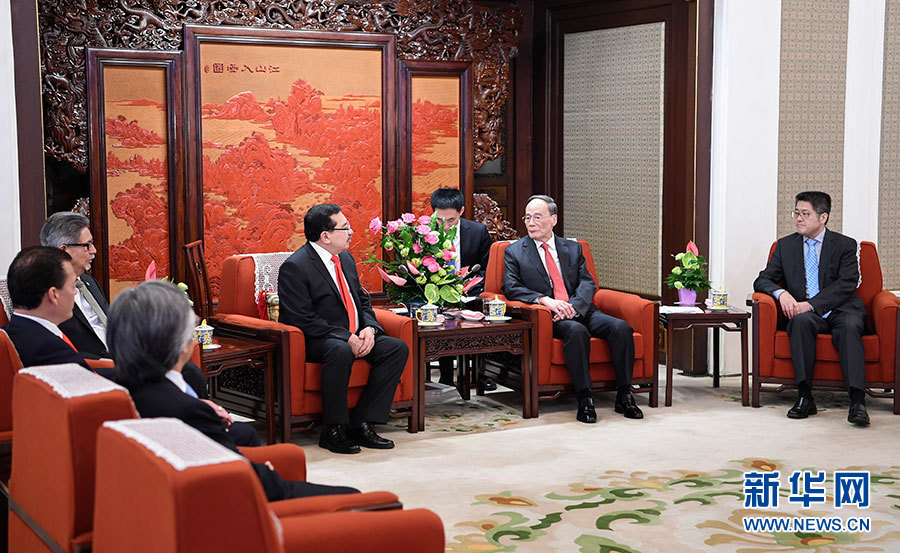 8月21日,國家副主席王岐山在北京中南海會見薩爾瓦多代理總統(tǒng)職務(wù)第一指定人岡薩雷斯、總統(tǒng)法律秘書阿爾瓦拉多、外長卡斯塔內(nèi)達。 新華社記者 張領(lǐng) 攝