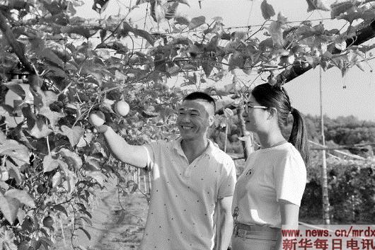 武平縣返鄉(xiāng)創(chuàng)業(yè)大學生王秀珍(右)與合作種植的果農一起查看百香果的生長情況。(本報記者郭圻攝)