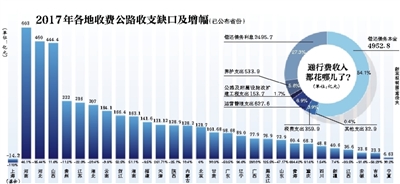 昨日(24日)上午,交通運輸部召開例行發(fā)布會,發(fā)布了《2017年全國收費公路統(tǒng)計公報》(以下簡稱《公報》),截至2017年底,全國收費公路債務(wù)余額52843.5億元,通行費收支缺口達4026.5億元,收費公路超八成的收入用于償還債務(wù)本金及利息。