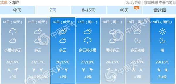 今天京城大部有小雨,北京市氣象臺預(yù)計,今天白天陰大部地區(qū)有小雨或零星小雨轉(zhuǎn)多云,早晨有輕霧或霧,北轉(zhuǎn)南風(fēng)二三級,最高氣溫28℃;夜間多云轉(zhuǎn)陰,北部山區(qū)有小雨,南風(fēng)二級轉(zhuǎn)北風(fēng)三四級,最低氣溫19℃。