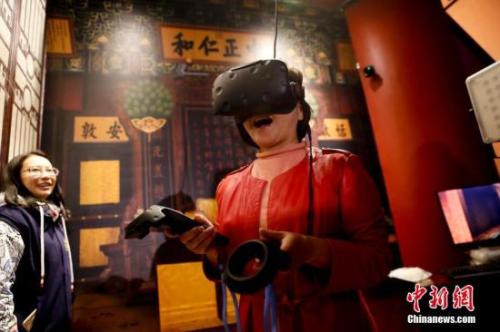 資料圖:"發(fā)現(xiàn)·養(yǎng)心殿——主題數(shù)字體驗(yàn)展”在故宮端門數(shù)字館全新亮相。圖為運(yùn)用VR技術(shù)參觀養(yǎng)心殿。中新社記者 杜洋 攝