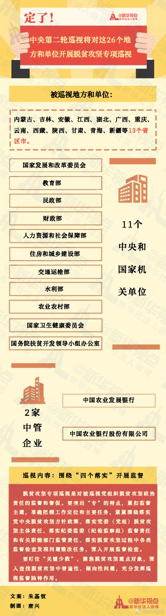 新華社北京10月9日電 經(jīng)黨中央批準(zhǔn),十九屆中央第二輪巡視將對內(nèi)蒙古、吉林、安徽、江西、湖北、廣西、重慶、云南、西藏、陜西、甘肅、青海、新疆、國家發(fā)展和改革委員會、教育部、民政部、財政部、人力資源和社會保障部、住房和城鄉(xiāng)建設(shè)部、交通運輸部、水利部、農(nóng)業(yè)農(nóng)村部、國家衛(wèi)生健康委員會、國務(wù)院扶貧開發(fā)領(lǐng)導(dǎo)小組辦公室、中國農(nóng)業(yè)發(fā)展銀行、中國農(nóng)業(yè)銀行股份有限公司等26個地方、單位黨組織開展脫貧攻堅專項巡視。