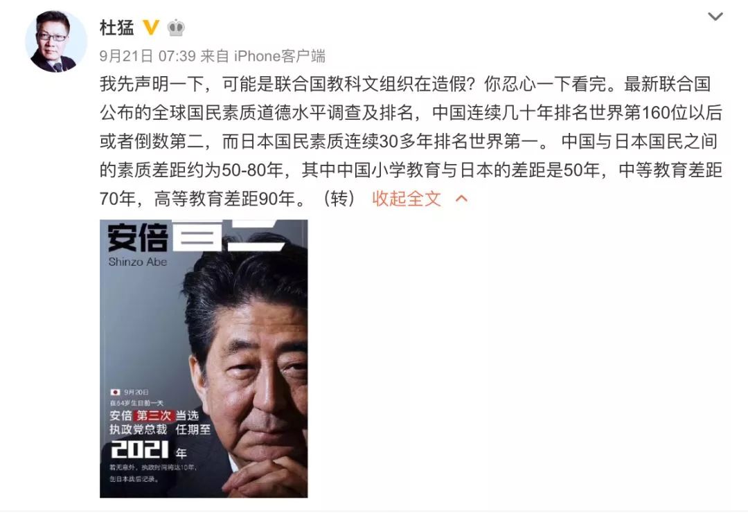 2018年9月21日,擁有近220萬(wàn)粉絲的大V“杜猛”一大清早就發(fā)布了一條微博:“最新聯(lián)合國(guó)公布的全球國(guó)民素質(zhì)道德水平調(diào)查及排名,中國(guó)連續(xù)幾十年排名世界第160位以后或者倒數(shù)第二,而日本國(guó)民素質(zhì)連續(xù)30多年排名世界第一。中國(guó)與日本國(guó)民之間的素質(zhì)差距約為50-80年,其中中國(guó)小學(xué)教育與日本的差距是50年,中等教育差距70年,高等教育差距90年?!彼m然在微博的最后加了個(gè)括號(hào)寫(xiě)了個(gè)“轉(zhuǎn)”字,但并未寫(xiě)明來(lái)源。配圖內(nèi)容是:前一天,安倍晉三第三次當(dāng)選日本執(zhí)政黨總裁。