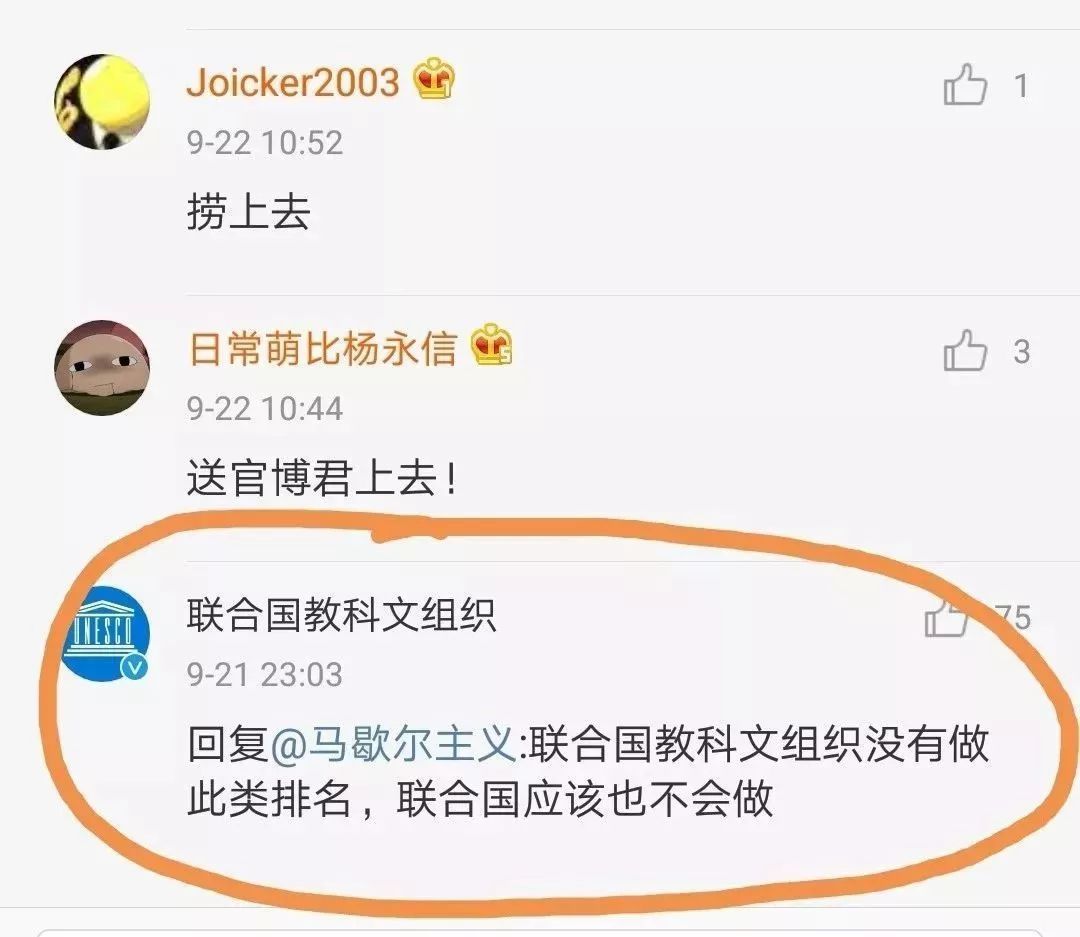 諷刺的是,“杜猛”還在微博最開(kāi)始加了句“我先聲明一下,可能是聯(lián)合國(guó)教科文組織在造假?你忍心一下看完?!苯Y(jié)果聯(lián)合國(guó)教科文組織的官方微博當(dāng)天就出來(lái)“強(qiáng)力打臉”,聲明“聯(lián)合國(guó)教科文組織沒(méi)有做此類排名,聯(lián)合國(guó)應(yīng)該也不會(huì)做?!边@條微博被多名網(wǎng)友舉報(bào),微博管理方最后對(duì)其做了“不實(shí)”的標(biāo)記,對(duì)博主禁言15天,但這條假消息并未被刪,仍然掛在那里,甚是刺眼。而作者在被處理前還接著轉(zhuǎn)發(fā)了好幾條貶低中國(guó)的評(píng)論。