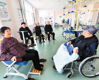 圖為山東省青州市,老人在醫(yī)養(yǎng)院里做康復訓練。王繼林 攝(人民視覺)