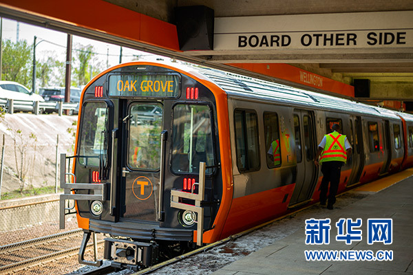 2018年5月15日在美國(guó)馬薩諸塞州梅德福德惠靈頓站拍攝的中車長(zhǎng)客為波士頓橙線地鐵“量身訂制”的首批車輛。新華社記者 李木子 攝