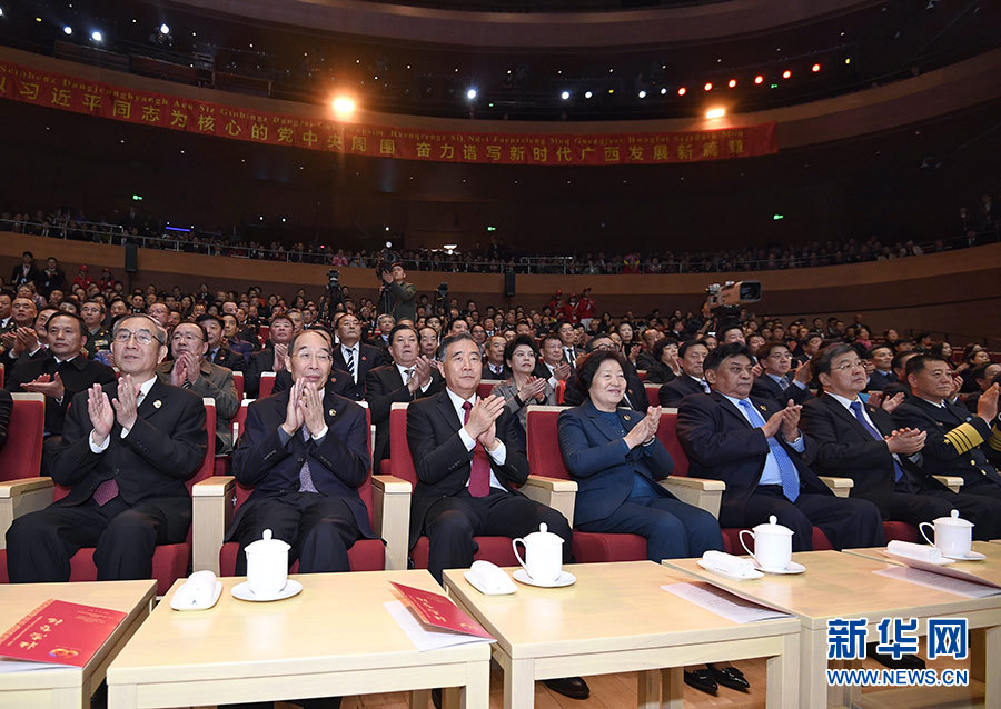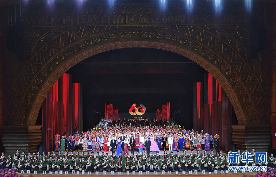 12月9日,慶祝廣西壯族自治區(qū)成立60周年文藝晚會《壯志飛揚》在廣西文化藝術中心精彩上演。中共中央政治局常委、全國政協(xié)主席、中央代表團團長汪洋和各族各界干部群眾等近900人觀看演出。 新華社記者 申宏 攝