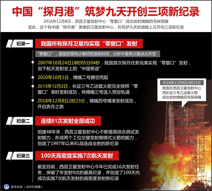 2018年12月8日,西昌衛(wèi)星發(fā)射中心“零窗口”成功發(fā)射嫦娥四號探測器。至此,這個(gè)有中國“探月港”美譽(yù)的衛(wèi)星發(fā)射中心,在筑夢九天的道路上又開創(chuàng)三項(xiàng)新紀(jì)錄。
