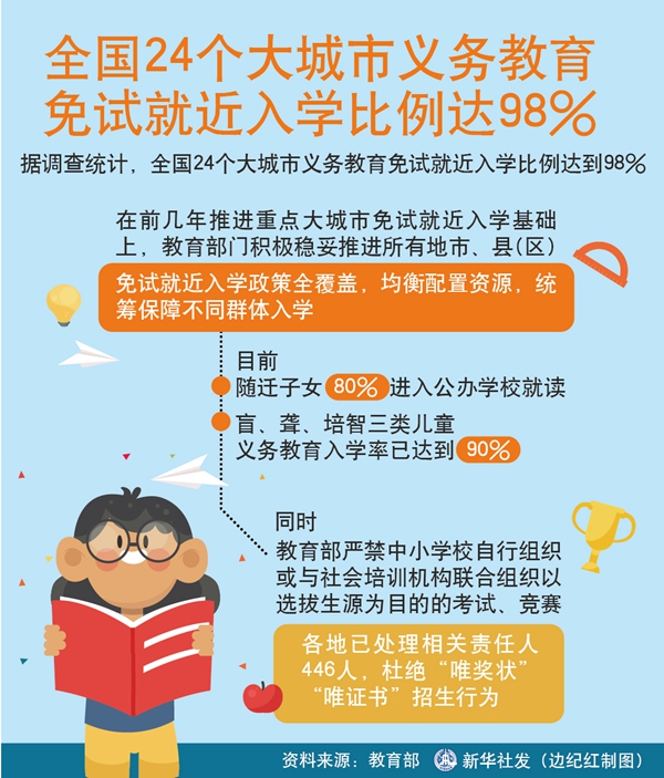 全國24個大城市義務(wù)教育免試就近入學(xué)比例達(dá)98% 新華社發(fā) 邊紀(jì)紅 制圖