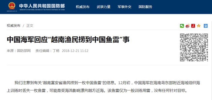 我們注意到有關(guān)“越南富安省漁民撈到一枚中國魚雷”的信息。12月初,中國海軍在海南島東部附近海域組織海上訓(xùn)練時丟失一枚魚雷,可能是受海流影響漂向越方近海。該魚雷僅為一般訓(xùn)練用雷,沒有任何針對目標。