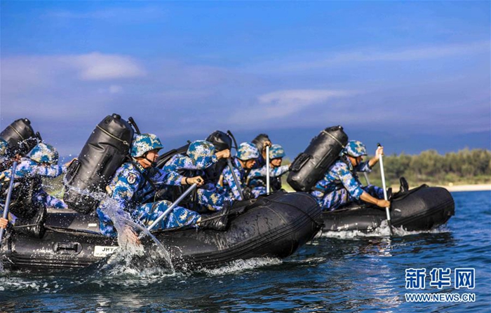 海軍陸戰(zhàn)隊(duì)某旅偵察營(yíng)在三亞某海域開(kāi)展劃舟訓(xùn)練(11月20日攝)。新華社發(fā)(范旭東 攝)