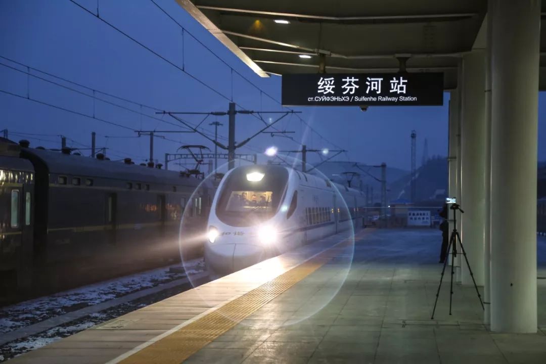2018-12-25,黑龍江省綏芬河市。12月25日6時(shí)31分,隨著D7961次列車駛進(jìn)黑龍江省最大的對(duì)俄口岸綏芬河站,綏芬河口岸迎來了期盼已久的動(dòng)車時(shí)代。作者:石頭