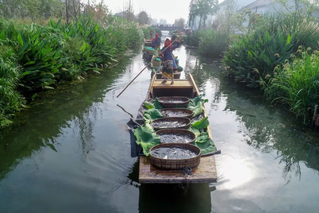 2018-09-23,江蘇泰州興化。在江蘇省興化市東羅村,農(nóng)民在“水上市集”展示特色農(nóng)產(chǎn)品。當(dāng)日是首屆中國(guó)農(nóng)民豐收節(jié),全國(guó)各地舉行豐富多彩的活動(dòng)慶祝豐收。作者:湯德宏