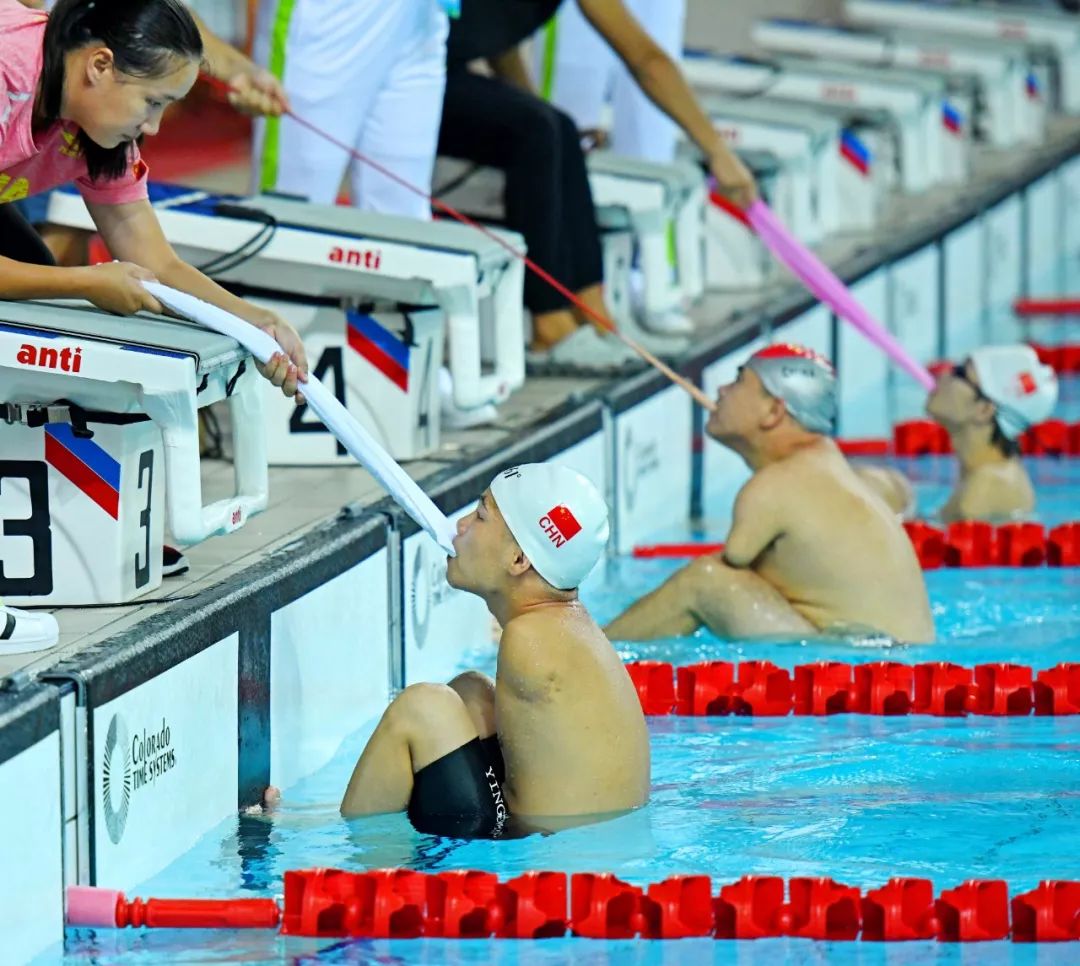 2018-08-28,廣東省肇慶市西江學(xué)院游泳館。三名重度殘障選手在游泳賽道上準(zhǔn)備一拼。當(dāng)日,廣東省第八屆殘疾人運(yùn)動(dòng)會(huì)游泳項(xiàng)目舉行決賽。作者:文兄言成