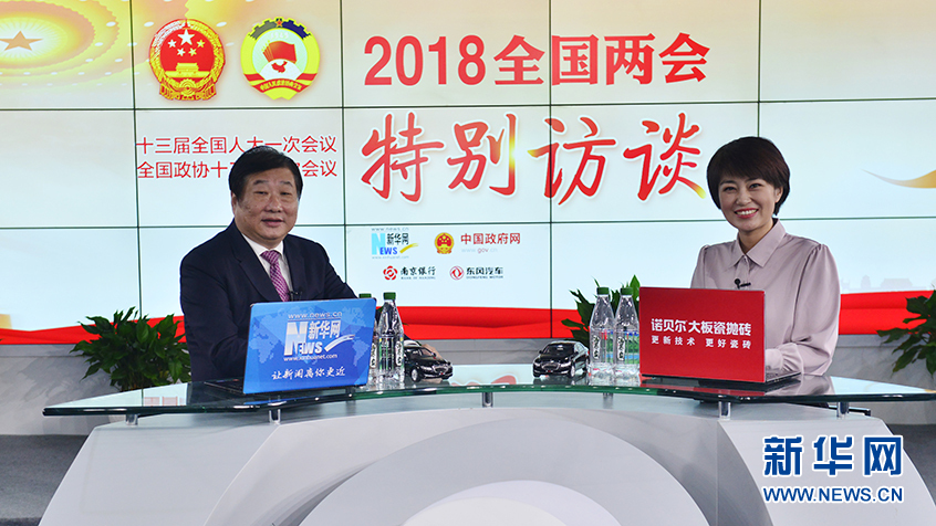 3月5日,全國(guó)人大代表、山東重工集團(tuán)董事長(zhǎng)、濰柴集團(tuán)董事長(zhǎng)譚旭光(左)做客新華網(wǎng)2018全國(guó)兩會(huì)特別訪談。新華網(wǎng) 李相博攝
