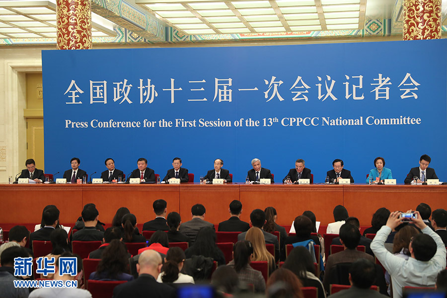 民主黨派中央和全國工商聯(lián)領(lǐng)導(dǎo)人記者會(huì)3月6日下午在人民大會(huì)堂金色大廳舉行,邀請(qǐng)民革中央主席萬鄂湘、民盟中央主席丁仲禮、民建中央主席郝明金、民進(jìn)中央主席蔡達(dá)峰、農(nóng)工黨中央主席陳竺、致公黨中央主席萬鋼、九三學(xué)社中央主席武維華、臺(tái)盟中央主席蘇輝、全國工商聯(lián)主席高云龍回答記者提問。圖為記者會(huì)現(xiàn)場(chǎng)。新華網(wǎng)/中國政府網(wǎng) 陳杰 攝