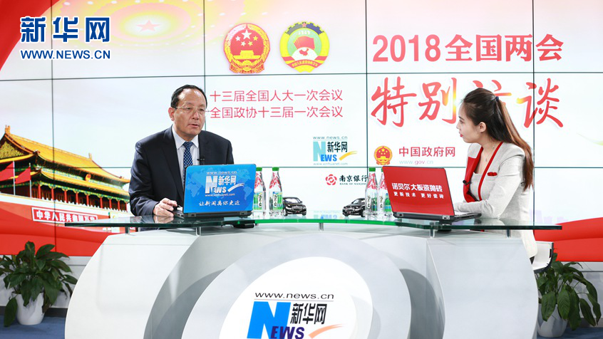 圖為全國(guó)人大代表,云南省迪慶藏族自治州委副書記、州長(zhǎng)齊建新(左)新做客新華網(wǎng)2018全國(guó)兩會(huì)特別訪談。新華網(wǎng) 楊锘攝
