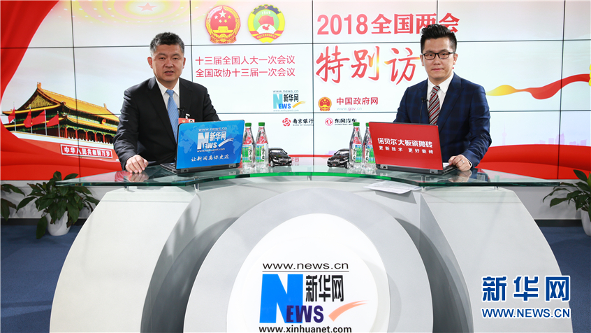 3月14日,全國政協(xié)委員,蒙草生態(tài)創(chuàng)始人、董事長王召明(左)做客新華網(wǎng)2018全國兩會(huì)特別訪談。新華網(wǎng) 楊锘攝