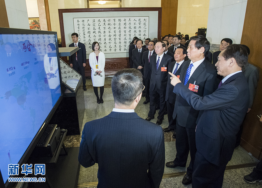 隨后,栗戰(zhàn)書走進(jìn)設(shè)在人民大會(huì)堂一樓大廳的新華社兩會(huì)新聞報(bào)道中心,仔細(xì)觀看了微視頻《誓言》、人工智能產(chǎn)品《“媒體大腦”帶你看憲法宣誓》、新華社兩會(huì)報(bào)道實(shí)時(shí)大數(shù)據(jù)展示、新華網(wǎng)“奮進(jìn)新時(shí)代 筑夢(mèng)新征程”兩會(huì)融媒體專題等,看望正在這里緊張工作的采編和技術(shù)人員,與參加兩會(huì)報(bào)道的新華社外籍記者親切交談。在觀看了新華社制作的融媒體產(chǎn)品《“90后”全國(guó)人大代表程桔:小丫回村當(dāng)書記》后,栗戰(zhàn)書對(duì)新聞媒體創(chuàng)新兩會(huì)報(bào)道給予充分肯定。