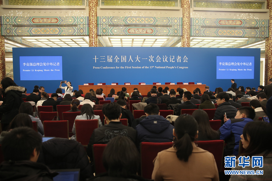 3月20日上午,十三屆全國人大一次會(huì)議閉幕后,國務(wù)院總理李克強(qiáng)將在人民大會(huì)堂三樓金色大廳會(huì)見采訪十三屆全國人大一次會(huì)議的中外記者并回答記者提出的問題。圖為記者會(huì)現(xiàn)場(chǎng)。 新華網(wǎng)/中國政府網(wǎng) 翟子赫 攝