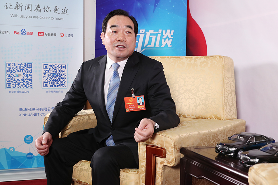 3月20日,全國(guó)人大代表、江蘇省徐州市市長(zhǎng)周鐵根做客新華網(wǎng)人民大會(huì)堂兩會(huì)特別訪談間。新華網(wǎng) 郝廣鵬 攝