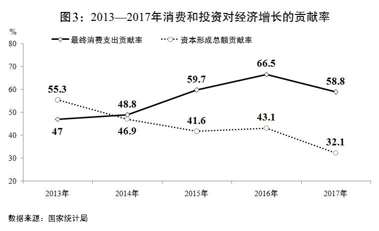 總的來看,2017年經(jīng)濟(jì)運(yùn)行穩(wěn)中向好態(tài)勢(shì)持續(xù)發(fā)展,決勝全面建成小康社會(huì)又向前邁出堅(jiān)實(shí)一步。在國(guó)內(nèi)外經(jīng)濟(jì)形勢(shì)極其錯(cuò)綜復(fù)雜的情況下,經(jīng)濟(jì)社會(huì)發(fā)展取得這樣的成績(jī)來之不易,這是以習(xí)近平同志為核心的黨中央堅(jiān)強(qiáng)領(lǐng)導(dǎo)的結(jié)果,是習(xí)近平新時(shí)代中國(guó)特色社會(huì)主義思想科學(xué)指引的結(jié)果,是黨的十八大以來黨中央、國(guó)務(wù)院一系列重大方針政策和重大舉措累積效應(yīng)的結(jié)果,更是全黨全國(guó)各族人民共同奮斗、各方面工作久久為功的結(jié)果。五年來,各地區(qū)各部門以習(xí)近平新時(shí)代中國(guó)特色社會(huì)主義思想為指引,堅(jiān)持穩(wěn)中求進(jìn)工作總基調(diào),貫徹新發(fā)展理念,“十二五”規(guī)劃勝利完成,“十三五”規(guī)劃順利實(shí)施。一是經(jīng)濟(jì)實(shí)力顯著增強(qiáng)。國(guó)內(nèi)生產(chǎn)總值從2012年的54萬億元增加到82.7萬億元,年均增長(zhǎng)7.1%,對(duì)世界經(jīng)濟(jì)增長(zhǎng)的貢獻(xiàn)率超過30%。二是發(fā)展質(zhì)量和效益明顯提高。全國(guó)一般公共預(yù)算收入從11.7萬億元增至17.3萬億元。全員勞動(dòng)生產(chǎn)率從人均7.3萬元提高到10萬元以上。居民人均可支配收入從1.7萬元增至2.6萬元,增速總體快于經(jīng)濟(jì)增長(zhǎng),城鄉(xiāng)居民收入倍差由2.88∶1下降至2.71∶1。單位國(guó)內(nèi)生產(chǎn)總值能耗降低20.9%。三是經(jīng)濟(jì)結(jié)構(gòu)發(fā)生重大變革。需求結(jié)構(gòu)“消費(fèi)超投資”,最終消費(fèi)對(duì)經(jīng)濟(jì)增長(zhǎng)的貢獻(xiàn)率提高了近4個(gè)百分點(diǎn)。產(chǎn)業(yè)結(jié)構(gòu)“三產(chǎn)超二產(chǎn)”,服務(wù)業(yè)占國(guó)民經(jīng)濟(jì)的比重不斷上升。區(qū)域發(fā)展格局不斷優(yōu)化,新型城鎮(zhèn)化扎實(shí)推進(jìn),8000多萬農(nóng)業(yè)轉(zhuǎn)移人口成為城鎮(zhèn)居民。四是新舊動(dòng)能加快接續(xù)轉(zhuǎn)換。供給側(cè)結(jié)構(gòu)性改革扎實(shí)推進(jìn),有效改善了市場(chǎng)供求關(guān)系和企業(yè)盈利狀況。創(chuàng)新驅(qū)動(dòng)發(fā)展戰(zhàn)略深入實(shí)施,天宮、蛟龍、天眼、悟空、墨子、大飛機(jī)等重大科技成果相繼問世,新產(chǎn)業(yè)新業(yè)態(tài)新模式層出不窮,傳統(tǒng)產(chǎn)業(yè)通過改造升級(jí)煥發(fā)生機(jī)。五是市場(chǎng)主體活力持續(xù)釋放。營(yíng)商環(huán)境不斷優(yōu)化,產(chǎn)權(quán)保護(hù)不斷加強(qiáng),公平競(jìng)爭(zhēng)市場(chǎng)環(huán)境進(jìn)一步健全。五年來,國(guó)務(wù)院部門行政審批事項(xiàng)削減44%,中央層面核準(zhǔn)的企業(yè)投資項(xiàng)目減少90%,中央政府定價(jià)項(xiàng)目縮減80%。大眾創(chuàng)業(yè)萬眾創(chuàng)新蓬勃發(fā)展,全國(guó)日均新登記企業(yè)從5400戶上升到1.66萬戶,活躍度保持在70%左右,經(jīng)濟(jì)社會(huì)發(fā)展內(nèi)生動(dòng)力不斷增強(qiáng)。六是改革開放全面深化。重要領(lǐng)域和關(guān)鍵環(huán)節(jié)改革取得突破性進(jìn)展,主要領(lǐng)域改革主體框架基本確立?!耙粠б宦贰背h由構(gòu)想逐步變?yōu)楝F(xiàn)實(shí),貿(mào)易大國(guó)地位更加鞏固,利用外資保持穩(wěn)定增長(zhǎng),我國(guó)對(duì)世界經(jīng)濟(jì)發(fā)展的影響力大幅提升。七是民生福祉得到有效保障。城鎮(zhèn)新增就業(yè)6600萬人以上,脫貧攻堅(jiān)取得決定性進(jìn)展,貧困人口減少6800多萬。覆蓋城鄉(xiāng)居民的社會(huì)保障體系基本建立,基本公共服務(wù)均等化程度不斷提高。八是生態(tài)環(huán)境建設(shè)保護(hù)力度持續(xù)加大。大氣、水、土壤污染防治行動(dòng)取得明顯成效,重點(diǎn)區(qū)域PM2.5平均濃度下降30%左右,生態(tài)文明制度體系加快形成,環(huán)境狀況得到改善。