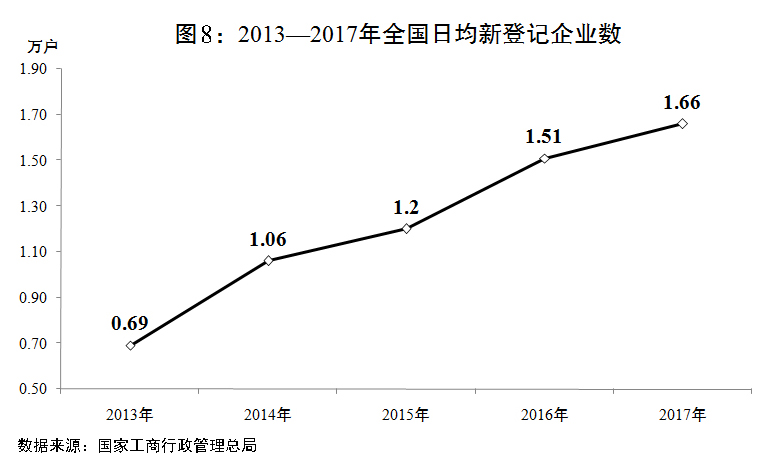 二是大眾創(chuàng)業(yè)萬眾創(chuàng)新不斷深化?!秶?guó)務(wù)院關(guān)于強(qiáng)化實(shí)施創(chuàng)新驅(qū)動(dòng)發(fā)展戰(zhàn)略進(jìn)一步推進(jìn)大眾創(chuàng)業(yè)萬眾創(chuàng)新深入發(fā)展的意見》(國(guó)發(fā)〔2017〕37號(hào))印發(fā)實(shí)施。新支持92個(gè)國(guó)家雙創(chuàng)示范基地建設(shè),建成4298家眾創(chuàng)空間、3255家科技企業(yè)孵化器和400余家企業(yè)加速器,第三屆全國(guó)雙創(chuàng)活動(dòng)周及“創(chuàng)響中國(guó)”巡回接力活動(dòng)成功舉辦。全年新登記企業(yè)達(dá)到607.4萬戶,增長(zhǎng)9.9%,日均新登記企業(yè)達(dá)到1.66萬戶。