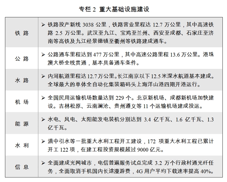 四是加強(qiáng)水利交通能源等基礎(chǔ)設(shè)施建設(shè)。今年要完成鐵路投資7320億元、公路水運(yùn)投資1.8萬億元左右,水利在建投資規(guī)模達(dá)到1萬億元。再開工一批重大水利工程,加強(qiáng)中小河流治理、小型病險(xiǎn)水庫除險(xiǎn)加固等水利薄弱環(huán)節(jié)建設(shè)。加快建設(shè)北京至沈陽、商丘經(jīng)合肥至杭州、鄭州至萬州高鐵,開工建設(shè)北京至雄安、和田至若羌等鐵路。有序發(fā)展高速公路,支持普通國(guó)省干線提級(jí)改造。進(jìn)一步完善通江達(dá)海、干支銜接的航道網(wǎng)絡(luò),提高干線航道通航能力和支線航道等級(jí)。積極推進(jìn)北京、成都、青島等新機(jī)場(chǎng)建設(shè),推進(jìn)一批樞紐機(jī)場(chǎng)改擴(kuò)建和支線機(jī)場(chǎng)項(xiàng)目建設(shè)。支持符合條件的城市有序發(fā)展城市軌道交通。推動(dòng)“互聯(lián)網(wǎng)+”便捷交通建設(shè),提升綜合交通服務(wù)質(zhì)量。加快構(gòu)建便捷高效、綠色安全骨干物流基礎(chǔ)設(shè)施網(wǎng)絡(luò)。落實(shí)能源生產(chǎn)和消費(fèi)革命戰(zhàn)略,推進(jìn)能源革命試點(diǎn)示范,開展非化石能源跨越發(fā)展行動(dòng),構(gòu)建清潔能源消納長(zhǎng)效機(jī)制,加快傳統(tǒng)能源清潔高效利用,加強(qiáng)電網(wǎng)、油氣管網(wǎng)布局優(yōu)化和互聯(lián)互通,增強(qiáng)天然氣供給保障能力和油氣儲(chǔ)備應(yīng)急能力。